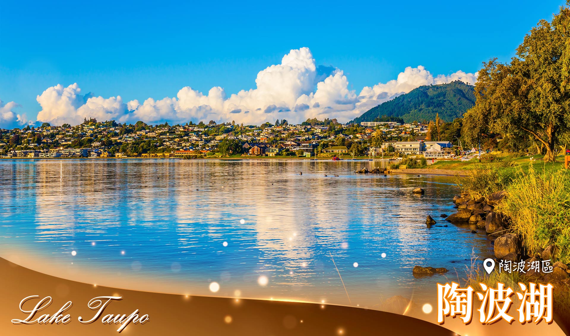 【陶波湖區】紐西蘭最大的湖泊,也是一個火山口湖,因難得的地理景觀,陶波小鎮成為跳傘及滑翔傘中心,是北島著名的旅遊勝地,其中以胡卡瀑布最具代表性。