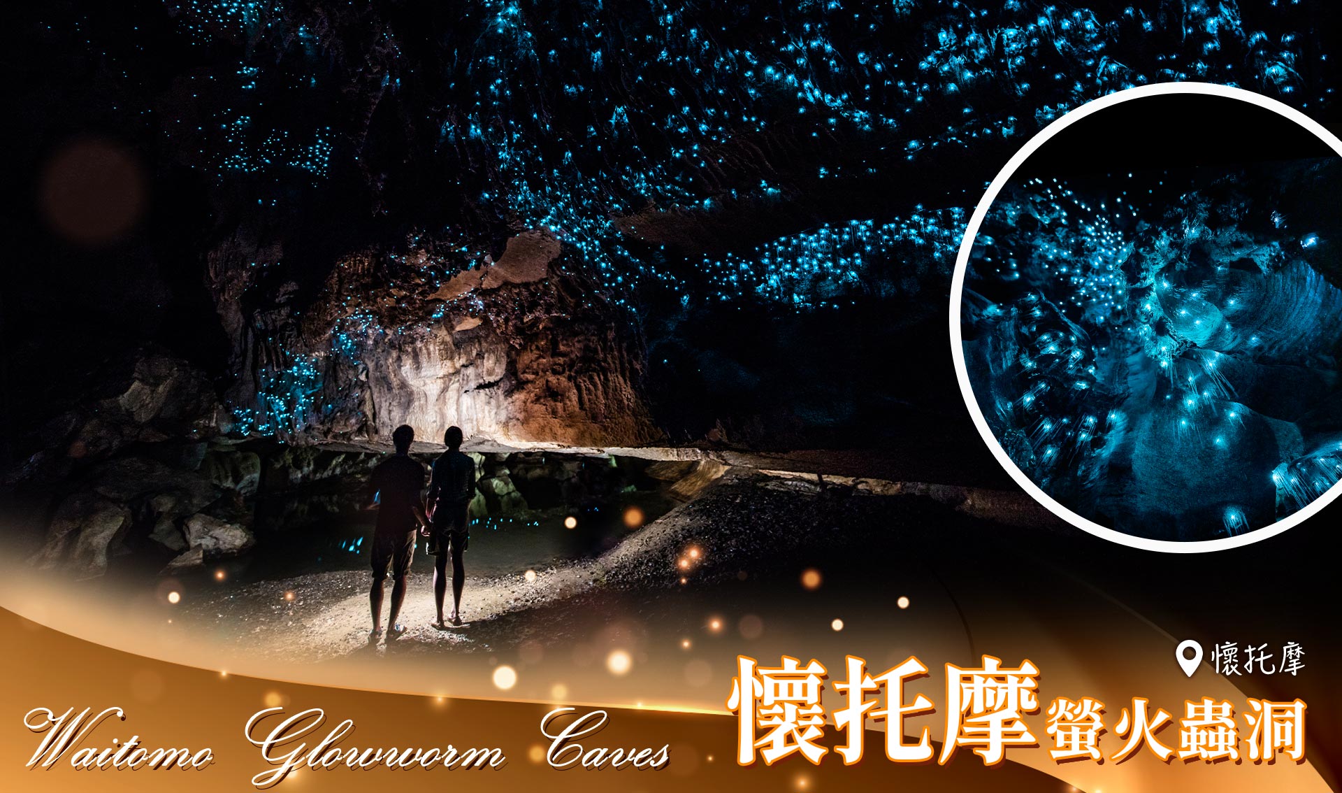 【威吐摩螢火蟲洞】在1887年毛利族族長陪當時的一個英國測量師在威吐摩的一個鐘乳石洞裏發現的。他們在洞裏時發覺在伸手不見五指的洞裏有佈滿了藍色的小星光,後來才知道這些是一種螢火蟲的幼蟲,這些幼蟲在尾部發出藍光,利用昆蟲的趨光性來吸引小蟲。進入這個伸手不見五指的洞穴,就會見到滿天的小亮點,看起來就和天空中的銀河一樣美麗,記得來到此一定要安靜, 不可以打攪這些稀有的螢火蟲喔!