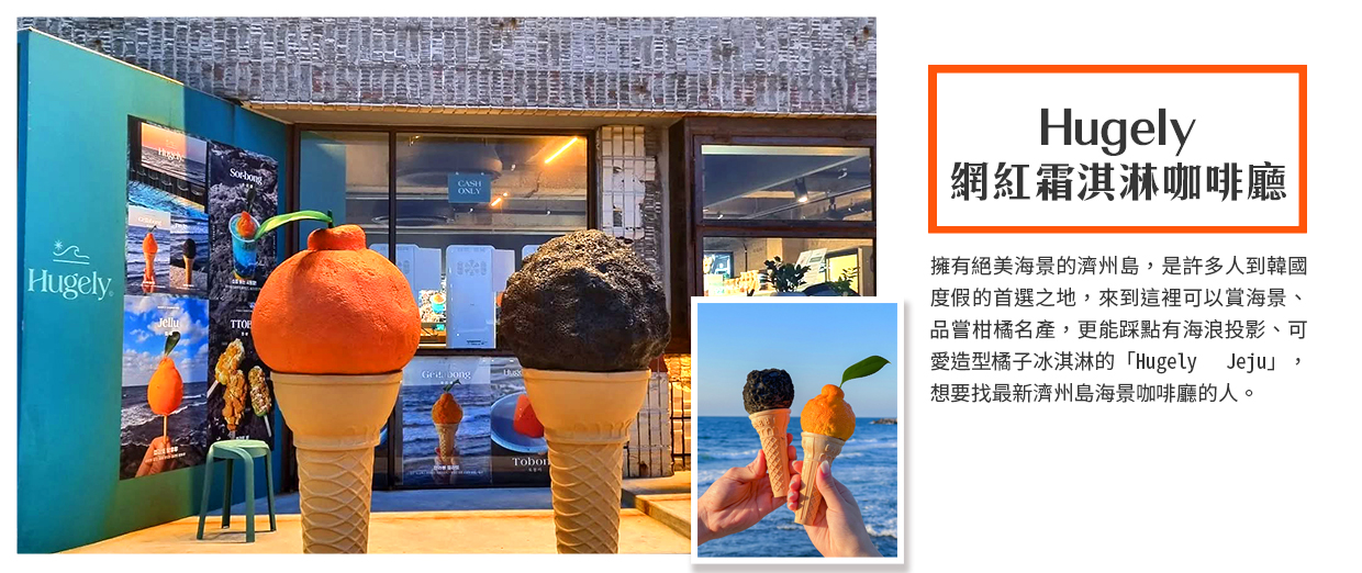 【Hugely網紅霜淇淋咖啡廳(店內消費旅客自理)】擁有絕美海景的濟州島,是許多人到韓國度假的首選之地,來到這裡可以賞海景、品嘗柑橘名產,更能踩點有海浪投影、可愛造型橘子冰淇淋的「Hugely Jeju」,想要找最新濟州島海景咖啡廳的人。