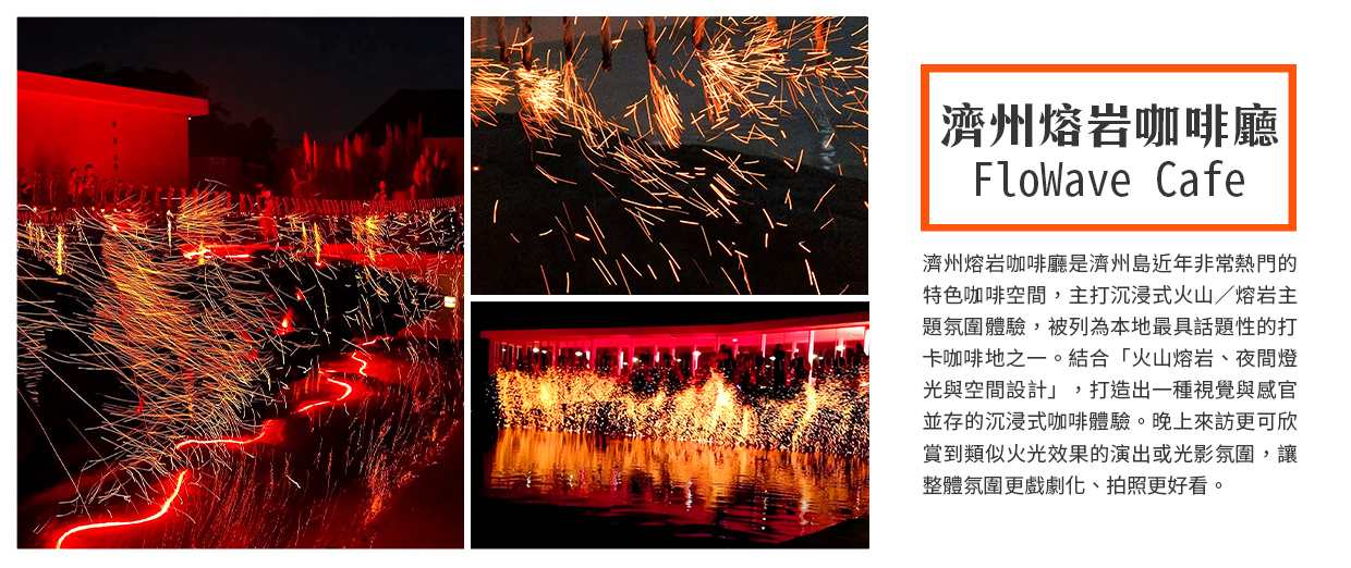 【濟州熔岩咖啡廳】濟州熔岩咖啡廳(FloWave Cafe) 是濟州島近年非常熱門的特色咖啡空間,主打 沉浸式火山/熔岩主題氛圍體驗,被列為本地最具話題性的打卡咖啡地之一。FloWave Cafe 的特色在於 結合「火山熔岩、夜間燈光與空間設計」,打造出一種 視覺與感官並存的沉浸式咖啡體驗。晚上來訪更可欣賞到 類似火光效果的演出或光影氛圍,讓整體氛圍更戲劇化、拍照更好看。