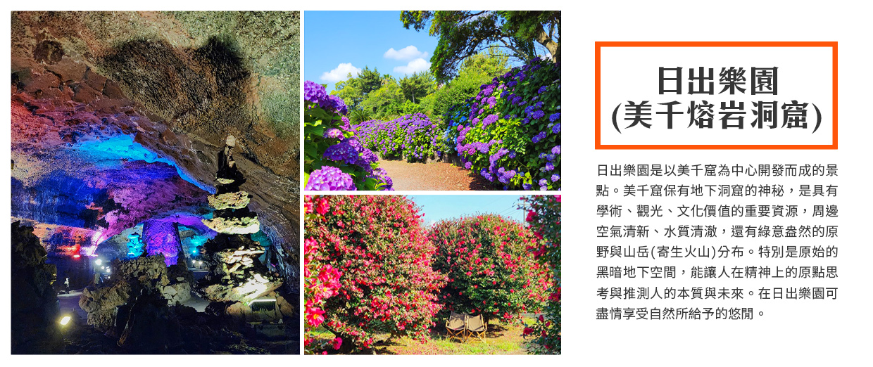 【日出樂園(美千熔岩洞窟)】日出樂園(美千窟觀光地區)是以美千窟為中心,於濟州島東部地區開發而成的景點。美千窟保有地下洞窟的神秘,是具有學術、觀光、文化價值的重要資源,周邊空氣清新、水質清澈,還有綠意盎然的原野與山岳(寄生火山)分布。特別是原始的黑暗地下空間,為創造的空間,能讓人在精神上的原點思考與推測人的本質與未來,內部擁有眾多值得一看的景點。在日出樂園可看到都市所感受不到的太陽升起的自然美,盡情享受自然所給予的悠閒。